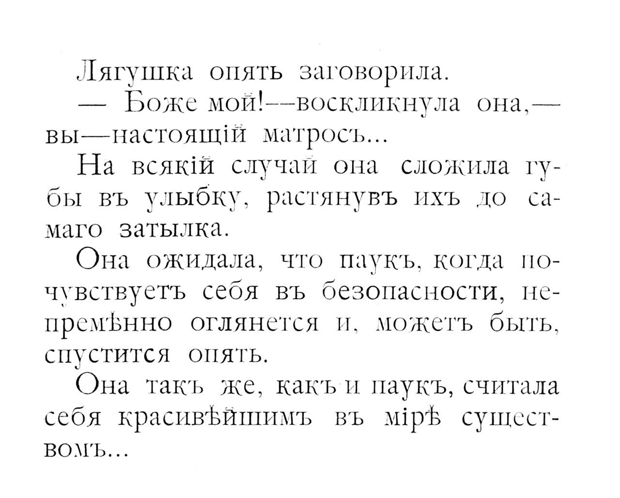 Она ожидала, что паукъ, когда почувствуеть сеоя въ безопасности, иепремЪвнно оглянется и. можетъ быть, спустится опять.
