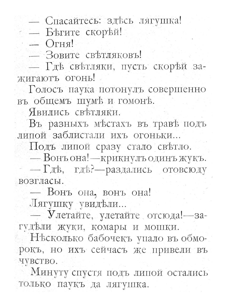 Минуту спустя подъ липой остались только паукъ да лягушка.