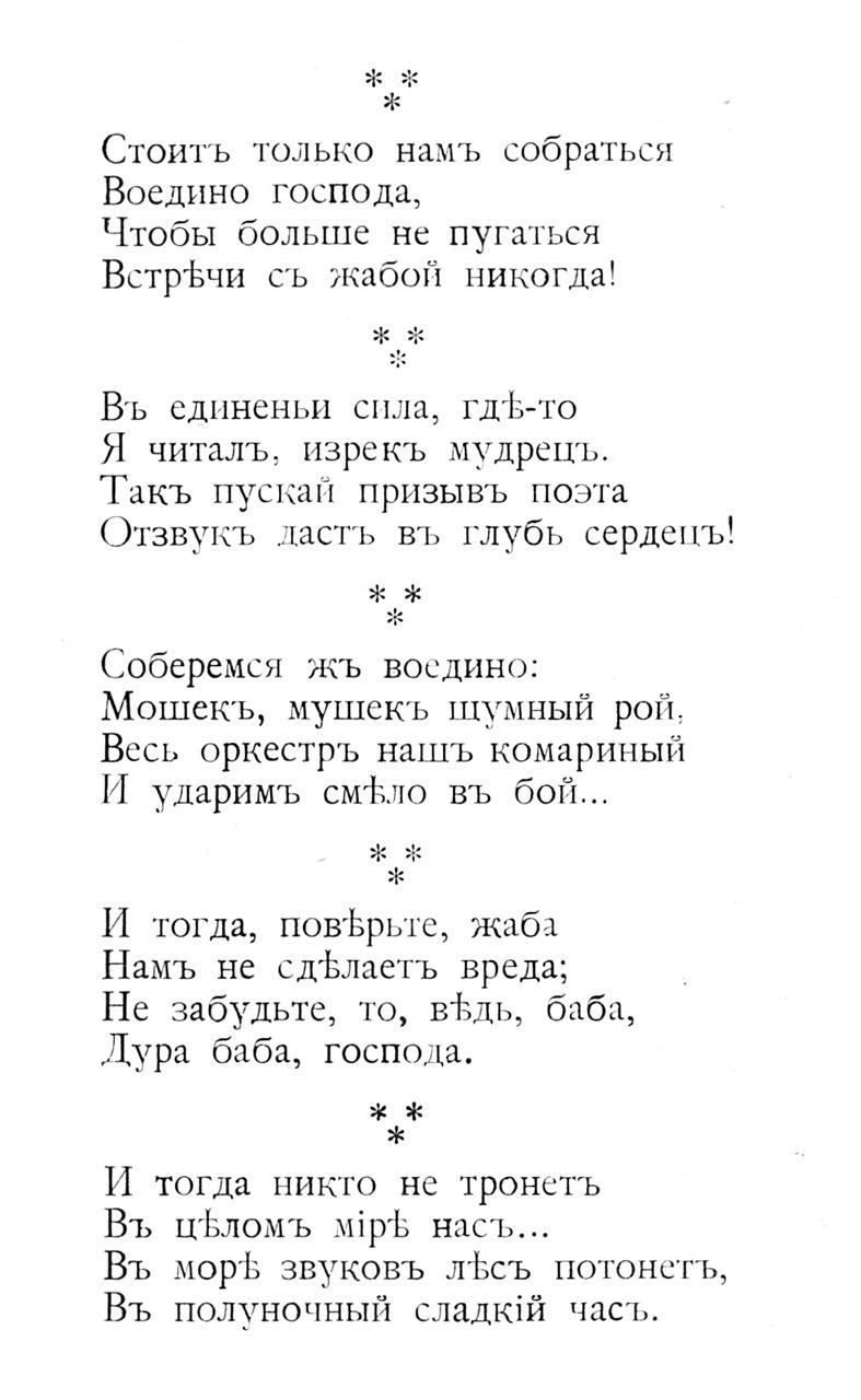Такъ пускай призывъ поэта Отзвукъ ласть въ глубь сердецъ! * * * Соберемся ж’ъ восдино: Мошекъ, мушекъ шумный рой, Весь оркестръ нашъ комариный И ударимъ смЪло въ бой...