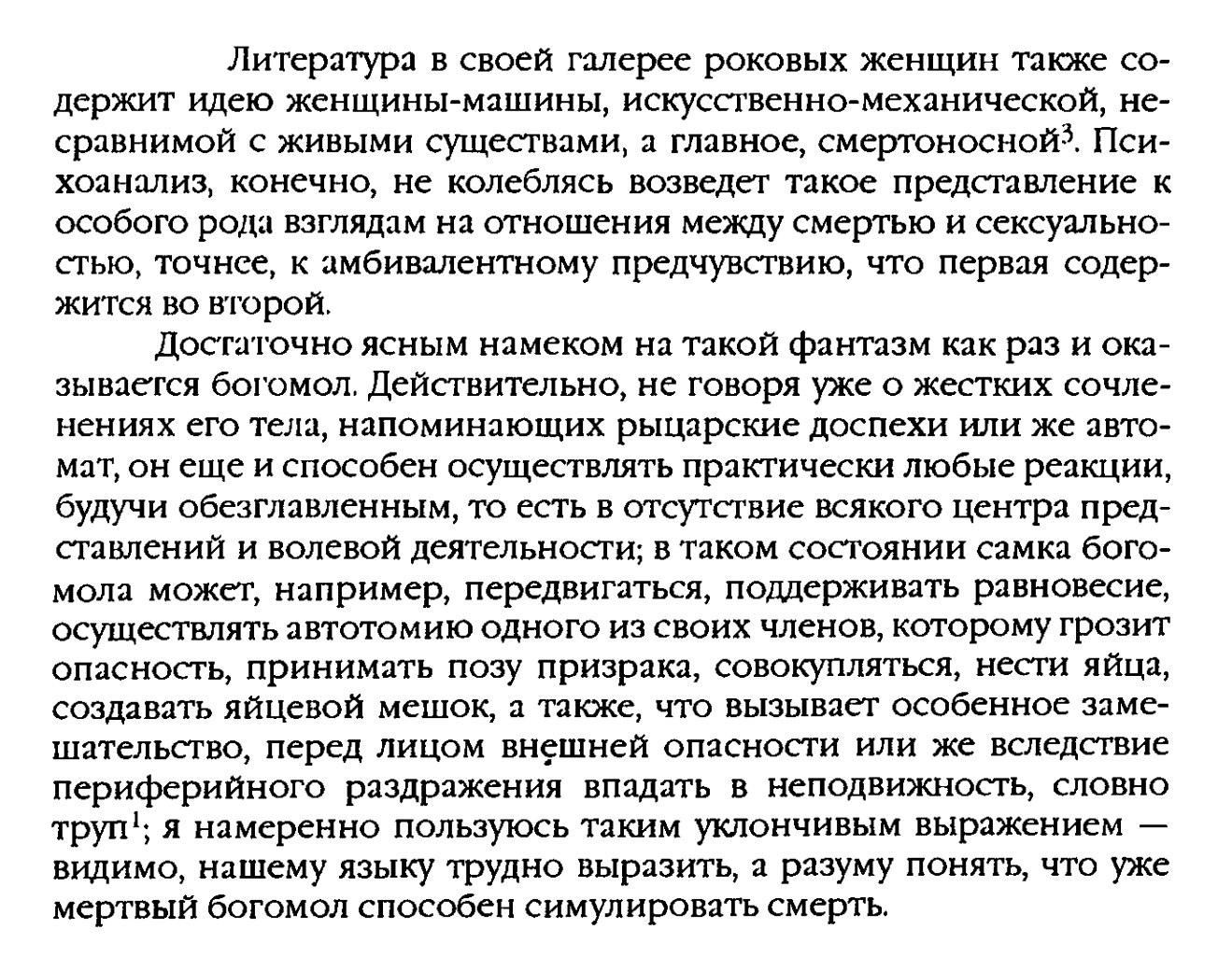 Достаточно ясным намеком на такой фантазм как раз и оказывается богомол. Действительно, не говоря уже о жестких сочленениях его тела, напоминающих рыцарские доспехи или же автомат, он еще и способен осуществлять практически любые реакции, будучи обезглавленным, то есть в отсутствие всякого центра представлений и волевой деятельности; в таком состоянии самка богомола может, например, передвигаться, поддерживать равновесие, осуществлять автотомию одного из своих членов, которому грозит опасность, принимать позу призрака, совокупляться, нести яйца, создавать яйцевой мешок, а также, что вызывает особенное замешательство, перед лицом внешней опасности или же вследствие периферийного раздражения впадать в неподвижность, словно труп\; я намеренно пользуюсь таким уклончивым выражением — видимо, нашему языку трудно выразить, а разуму понять, что уже мертвый богомол способен симулировать смерть.