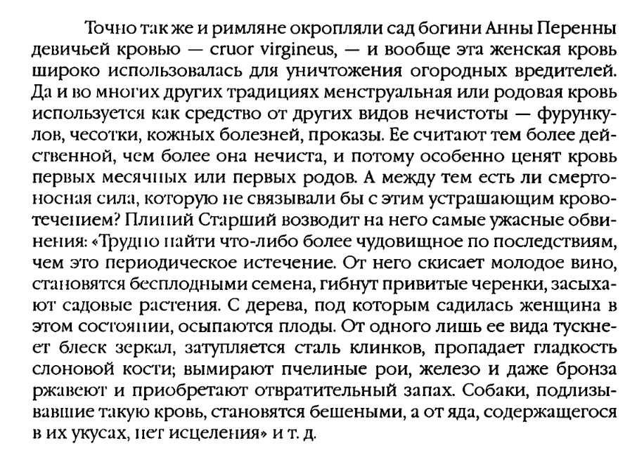 Точно также и римляне окропляли сад богини Анны Перенны девичьей кровью — сгиог уйга!пеи5, — и вообще эта женская кровь широко использовалась для уничтожения огородных вредителей. Да и во многих других традициях менструальная или родовая кровь используется как средство от других видов нечистоты — фурункулов, чесотки, кожных болезней, проказы. Ее считают тем более действенной, чем более она нечиста, и потому особенно ценят кровь первых месячных или первых родов. А между тем есть ли смертоносная сила, которую не связывали бы с этим устрашающим кровотечением? Плиипий Старший возводит на него самые ужасные обвинения: «Трудпо пайти что-либо более чудовищное по последствиям, чем это периодическое истечение. От него скисает молодое вино, становятся бесплодными семена, гибнут привитые черенки, засыхают садовые растения. С дерева, под которым садилась женщина в этом состоянии, осыпаются плоды. От одного лишь ее вида тускнеет блеск зеркал, затупляется сталь клинков, пропадает гладкость слоновой кости; вымирают пчелиные рои, железо и даже бронза ржавеют и приобретают отвратительный запах. Собаки, подлизывавшие такую кровь, становятся бешеными, а от яда, содержащегося вих укусах, пет исцеления» и т. Д.