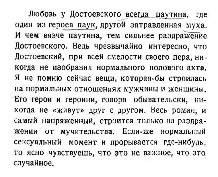 Любовь у Достоевского всегда _паутина, где один `из героев_паук, другой затравленная муха. И чём вязче паутина, тем сильнее раздражение Достоевского. Ведь чрезвычайно интересно, что Достоевский, при всей смелости своего пера, никогда не изобразил нормального полового акта. Я не помню сейчас вещи, которая-бы строилась на нормальных отношениях мужчины и женщины, Его герои и героини, говоря обывательски, никогда не «живут» друг с другом. Весь роман, и самый напряженный, строится только на раздражении от мучительства. Если-же нормальный сексуальный момент и прорывается где-нибудь, то ясно чувствуешь, что это не ва:жное, что это случайное,