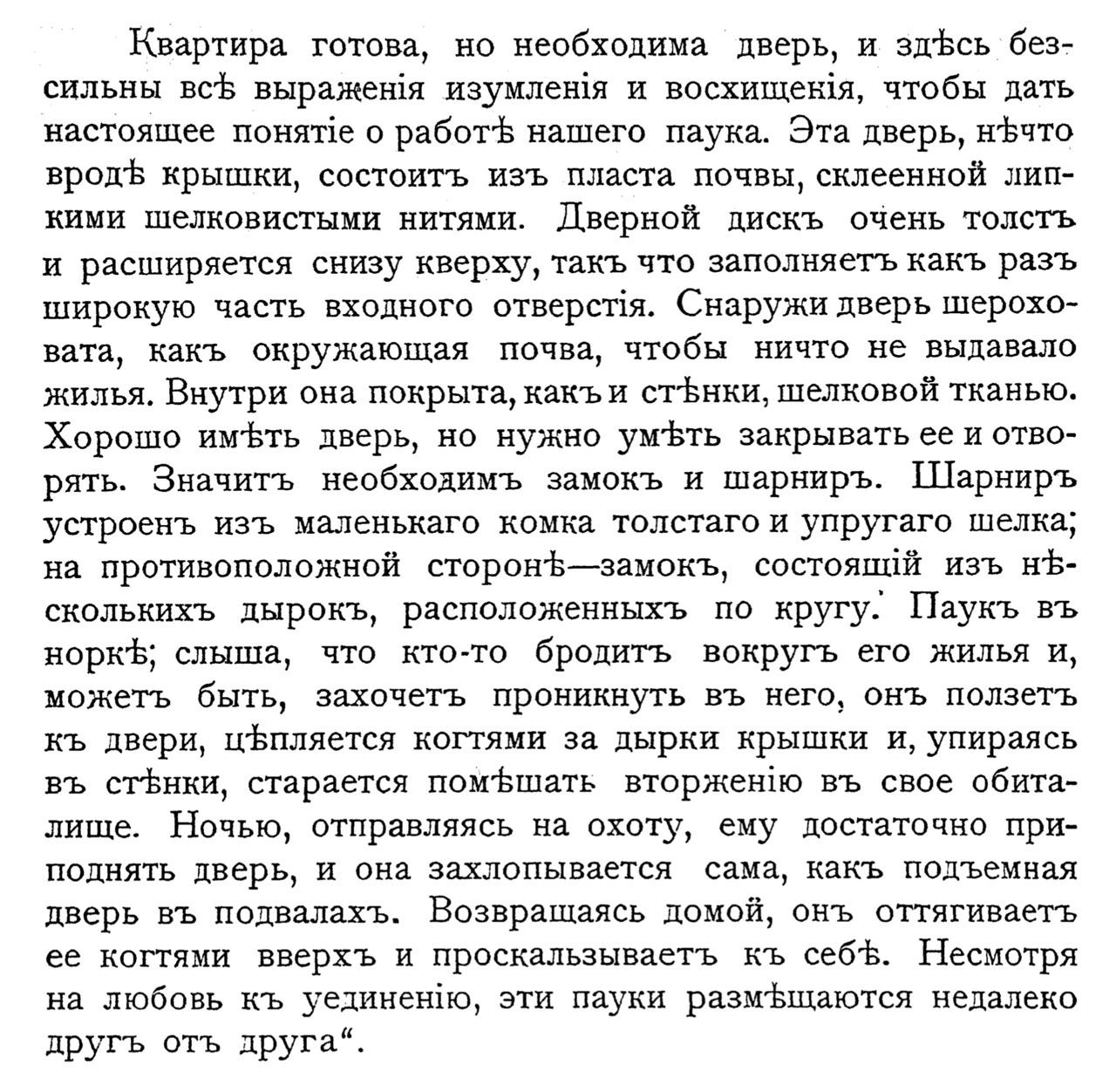 Квартира готова, но необходима дверь, и здЪсь безсильны вс® выраженя изумлешня и восхищения, чтобы дать настоящее понят!е о работЪ нашего паука. Эта дверь, нЪчто врод®Ъ крышки, состоитъ изъ пласта почвы, склеенной липкими шелковистыми нитями. Дверной дискъ очень толстъ и расширяется снизу кверху, такъ что заполняетъ какъ разъ широкую часть входного отверстя. Снаружи дверь шероховата, какъ окружающая почва, чтобы ничто не выдавало жилья. Внутри она покрыта, какъи стЪнки, шелковой тканью. Хорошо имЪть дверь, но нужно умЪть закрывать ее и отворять. Значитъь необходимъ замокъ и шарниръ. Шарниръ устроенъ изъ маленькаго комка толстаго и упругаго шелка; на противоположной сторонЪ—замокъ, состояпий изъЪ нФсколькихъ дырокъ, расположенныхъ по кругу. Паукъ въ норкЪ; слыша, что кто-то бродитъь вокругъ его жилья И, можетъ быть, захочетъ проникнуть въ него, онъ ползетъ къ двери, цЪпляется когтями за дырки крышки и, упираясь въ стЪнки, старается помЪшать вторженю въ свое обиталище. Ночью, отправляясь на охоту, ему достаточно приподнять дверь, и она захлопывается сама, какъ подъемная дверь въ подвалахъ. Возвращаясь домой, онъ оттягиваетъ ее когтями вверхъ и проскальзываетъ къ себ®. Несмотря на любовь къ уединеню, эти пауки размЪщаются недалеко другъ отъ друга“.