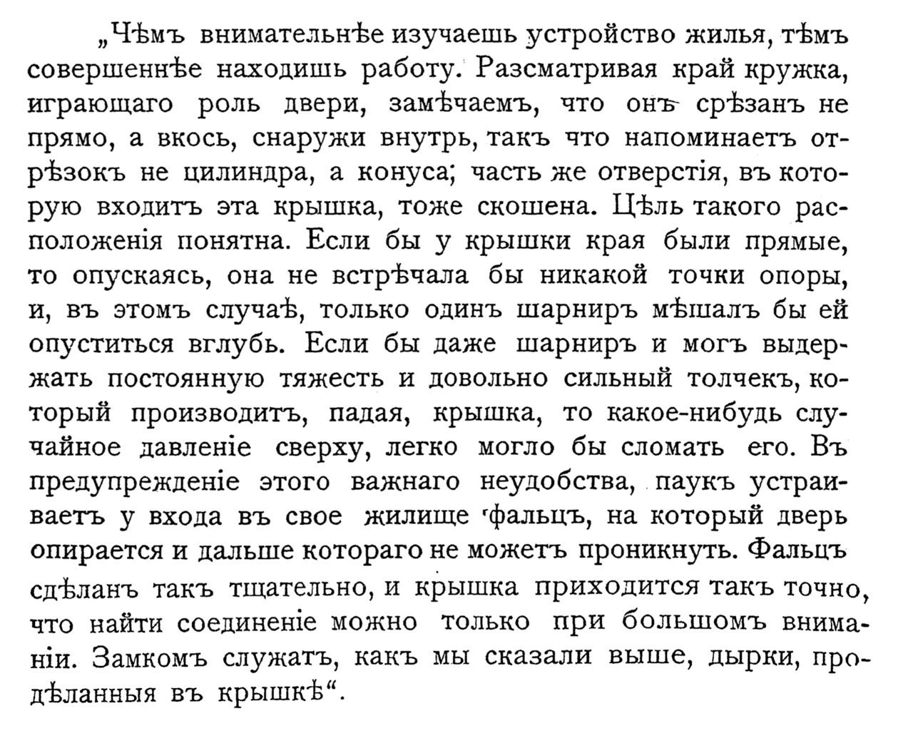 „ЧъЪмъ внимательнЪе изучаешь устройство жилья, тБмъ совершеннЪе находишь работу. Разсматривая край кружка, играющаго роль двери, замФчаемъ, что онъ срЪзанъ не прямо, а вкось, снаружи внутрь, такъ что напоминаетъ отрЪзокъ не цилиндра, а конуса; часть же отверстя, въ которую входитъ эта крышка, тоже скошена. Цль такого расположеня понятна. Если бы у крышки края были прямые, то опускаясь, она не встрЪчала бы никакой точки опоры, и, въ этомъ случаЪ, только одинъ шарниръ мЪшалъ бы ей опуститься вглубь. Если бы даже шарниръ и могъ выдержать постоянную тяжесть и довольно сильный толчекъ, который производитъ, падая, крышка, то какое-нибудь случайное давленте сверху, легко могло бы сломать его. Въ предупрежденте этого важнаго неудобства, паукъ устраиваетъ у входа въ свое жилище ‘фальцъ, на который дверь опирается и дальше котораго не можетъ проникнуть. Фалыцъ сдЪланъ такъ тщательно, и крышка приходится такъ точно, что найти соединене можно только при большомъ вниман1и. Замкомъ служатъ, какъ мы сказали выше, дырки, продЪланныя въ крышкЪ“.