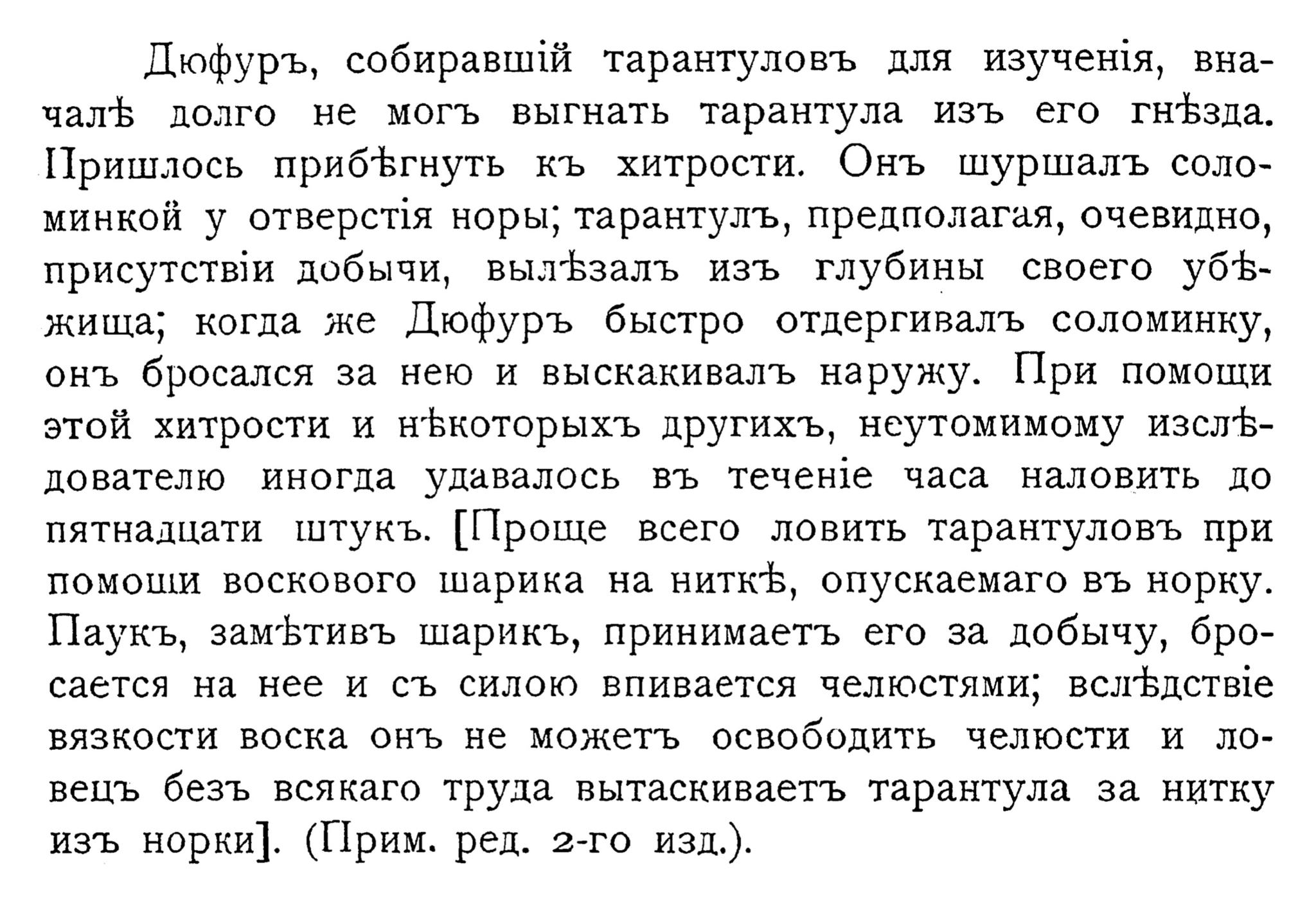 Дюфуръ, собиравший тарантуловъ для изученя, вначалЪ долго не могъ выгнать тарантула изъ его гнЪзэда. Пришлось прибЪгнуть къ хитрости. Онъ шуршалъ соломинкой у отверстя норы; тарантулъ, предполагая, очевидно, присутстви добычи, вылЪзалъ изъ глубины своего уб+жища; когда же Дюфуръ быстро отдергивалъ соломинку, онъ бросался за нею и выскакивалъ наружу. При помощи этой хитрости и нЪкоторыхъ другихъ, неутомимому изслЪдователю иногда удавалось въ теченле часа наловить до пятнадцати штукъ. [Проще всего ловить тарантуловъ при помощи воскового шарика на ниткЪ, опускаемаго въ норку. Паукъ, замЪтивъ шарикъ, принимаетъ его за добычу, бросается на нее и съ силою впивается челюстями; вслЪдствте вязкости воска онъ не можетъ освободить челюсти и ловецъ безъ всякаго труда вытаскиваетъ тарантула за нитку изъ норки]. (Прим. ред. 2-го изд.).