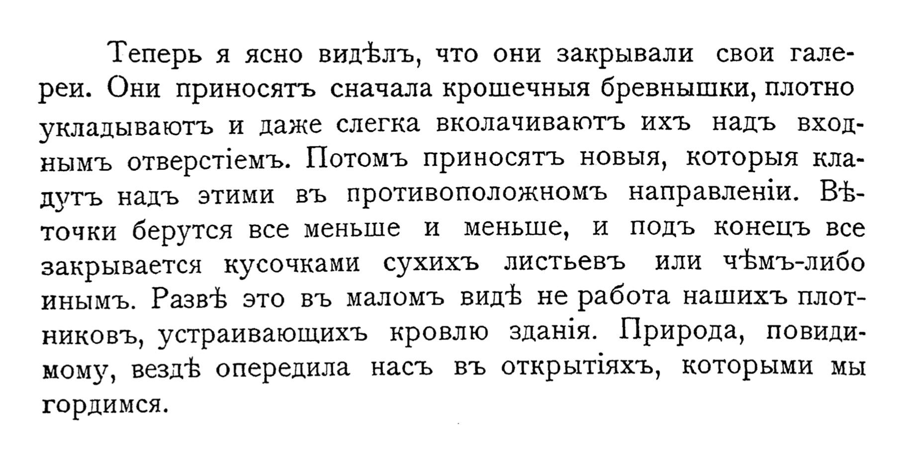 Теперь я ясно видЪлъ, что они закрывали свой галереи. Они приносятъ сначала крошечныя бревнышки, плотно укладываютъ и даже слегка вколачиваютъ ихЪ надъ входнымъ отверстемъ. Потомъ приносятъ новыя, которыя кладутъ надъ этими въ противоположномъЪ направлени. В+Ъточки берутся все меньше и меньше, и подъ конецъ все закрывается кусочками сухихъ листьевъ или чЪмъ-либо инымъ. РазвЪ это въ маломъ видЪ не работа нашихъ плотниковъ, устраивающихъ кровлю здания. Природа, повидимому, вездЪ опередила насъ въ открытмяхъ, которыми мы гордимся.