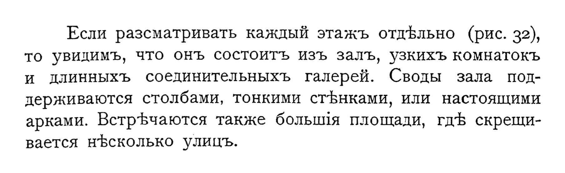 Если разсматривать каждый этажъ отдЪльно (рис. 32), то увидимъ, что онъ состоитъ изъ залъ, узкихъ комнатокъ и длинныхъ соединительныхъ галерей. Своды зала поддерживаются столбами, тонкими стЪнками, или настоящими