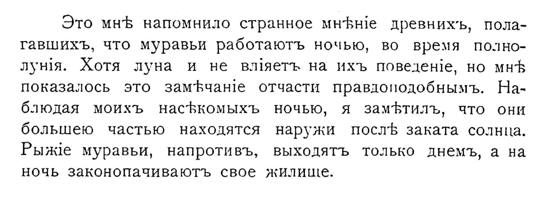 Это мнЪ напомнило странное мнЪне древнихъ, полагавшихъ, что муравьи работаютъ ночью, во время полнолуня. Хотя луна и не вляетъ на ихъ поведенте, но мнФ показалось это замЪчание отчасти правдоподобнымъ. Наблюдая моихъ насФкомыхъ ночью, я замФтилъ, что они большею частью находятся наружи послЪ заката солниа. Рылче муравьи, напротивъ, выходятъ только днемъЪ, а на ночь законопачиваютъ свое жилище.
