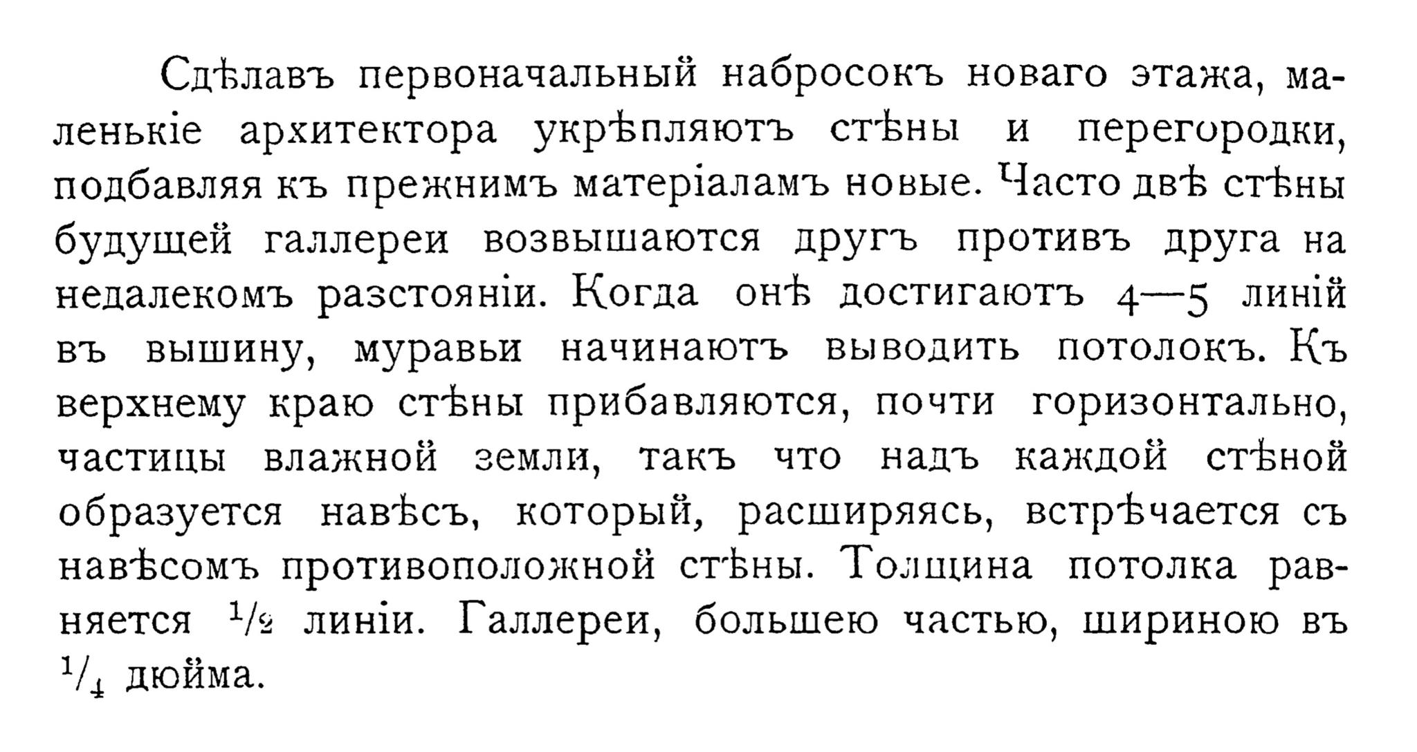 СдЪлавъ первоначальный набросокъ новаго этажа, маленьке архитектора укрЪпляютъ стБВны и перегородки, подбавляя къ прежнимъ матерталамъ новые. Часто дв® стЬны будущей галлереи возвышаются другъ противъ друга на недалекомъ разстояни. Когда онЪ достигаютъ 4—5 лишй въ вышину, муравьи начинаютъ выводить потолокъ. Къ верхнему краю стБны прибавляются, почти горизонтально, частицы влажной эземли, такъ что надъ каждой стЪной образуется навЪсъ, который, расширяясь, встрБчается съ навЪсомъ противоположной стЪны. Толщина потолка рав няется */в линии. Галлереи, большею частью, шириною въ 1/, дюйма.