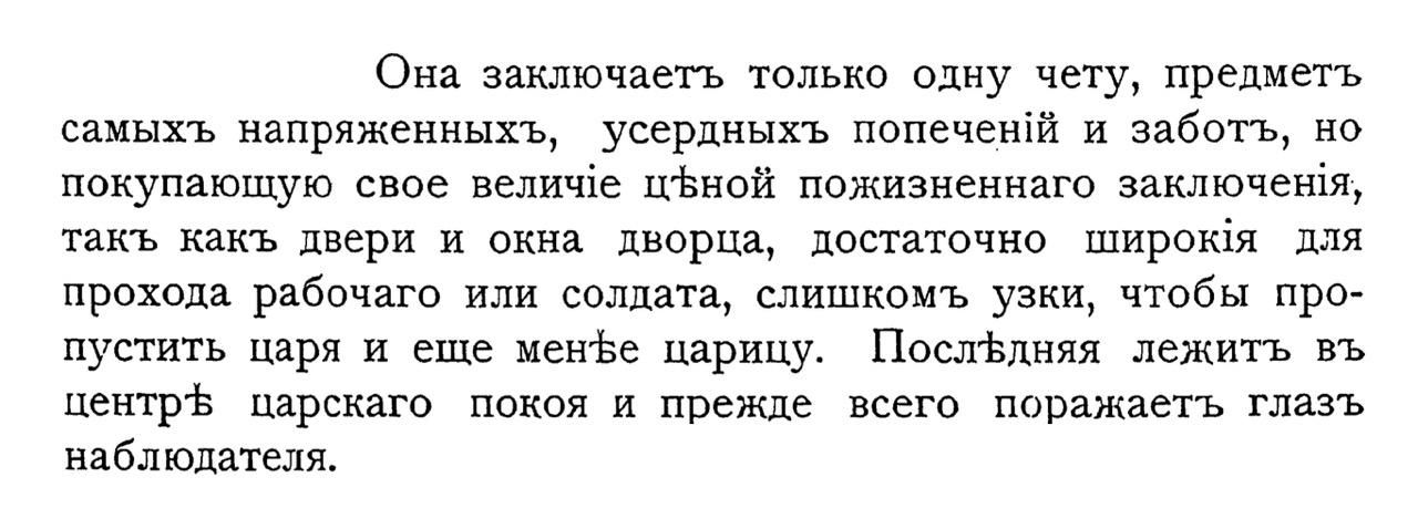 Она заключаетъ только одну чету, предметъ самыхъ напряженныхъ, усердныхъ попеченйй и заботъ, но покупающую свое велище цЪной пожизненнаго заключения, такъ какъ двери и окна дворца, достаточно широкмя для прохода рабочаго или солдата, слишкомъ узки, чтобы пропустить царя и еще менЪе царицу. ПослЪдняя лежитъ въЪ