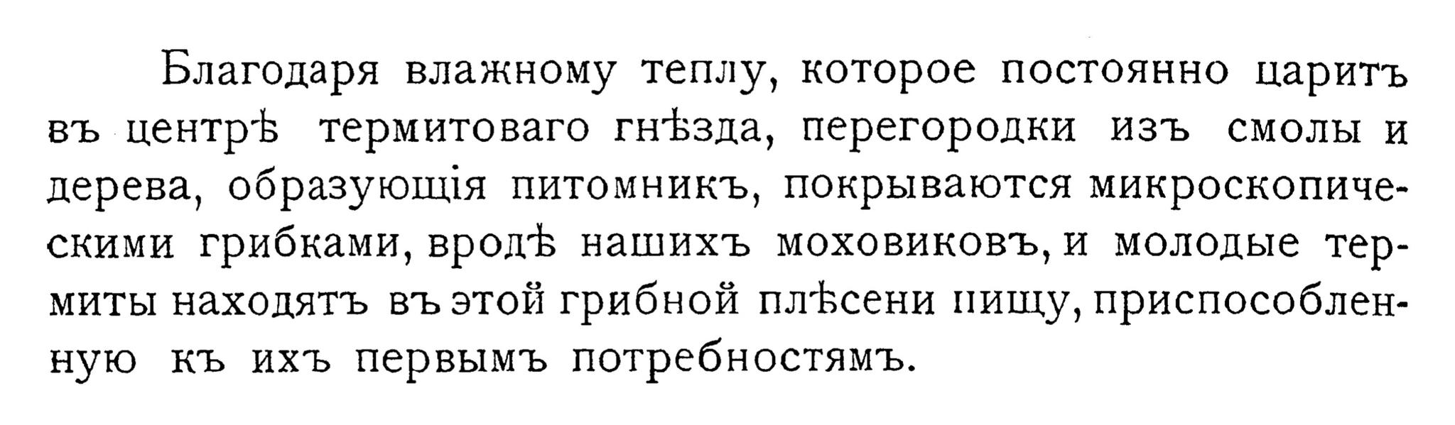 Благодаря влажному теплу, которое постоянно царитъ въ центрЪ термитоваго гнЪзда, перегородки изъ смолы и дерева, образуюшия питомникъ, покрываются микроскопическими грибками, вродЪ нашихъ моховиковъЪ, и молодые термиты находятъ въ этой грибной плЪсени пищу, приспособленную къ ихъ первымъ потребностямЪ.