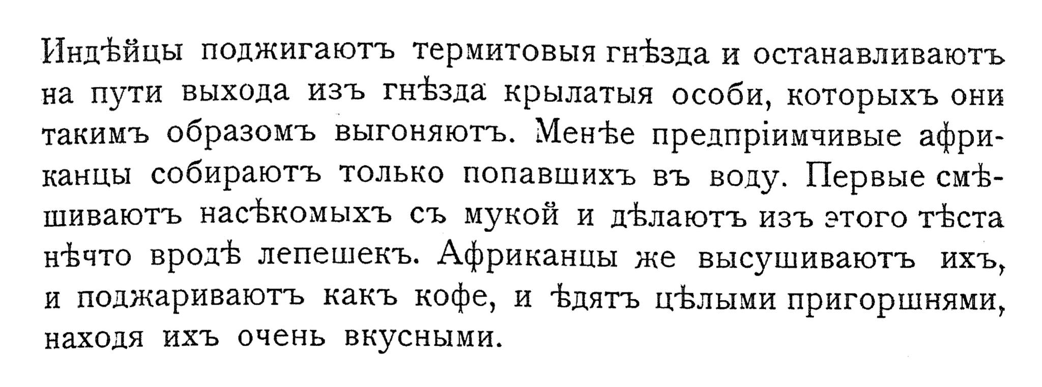 ИндЪйцы поджигаютъ термитовыя гнЪэда и останавливаютъ на пути выхода изъ гнЪзда крылатыя особи, которыхъ они такимъ образомъ выгоняютъ. МенЪе предприимчивые африканцы собираютъ только попавшихъ въ воду. Первые смЪшиваютъ насЪкомыхЪ съ мукой и дЪлаютъ изъ этого тЪста нЪчто вродЪ лепешекъ. Африканцы же высушиваютъ ихъ,