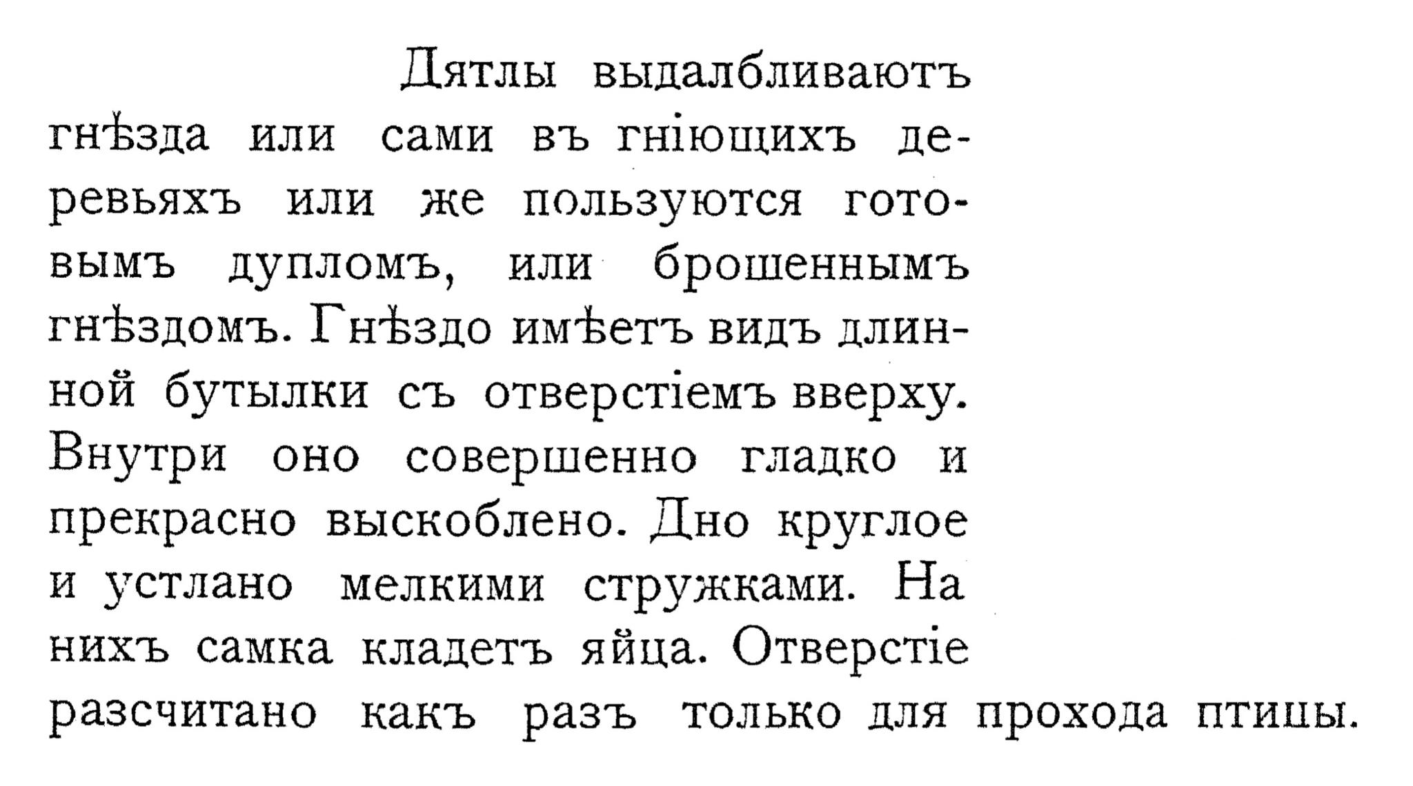 Дятлы выдалбливаютъ гнЪзда или сами въ гЫющихЪ деревьяхъ или же пользуются готовымъ дупломъ, или брошеннымъ гнЪздомъ. ГнЪздо имФетъ видъЪ длинной бутылки съ отверстемъ вверху. Внутри оно совершенно гладко и прекрасно выскоблено. Дно круглое и устлано мелкими стружками. На нихъ самка кладетъ яйца. Отверстте разсчитано какъ разъ только для прохода птипы.