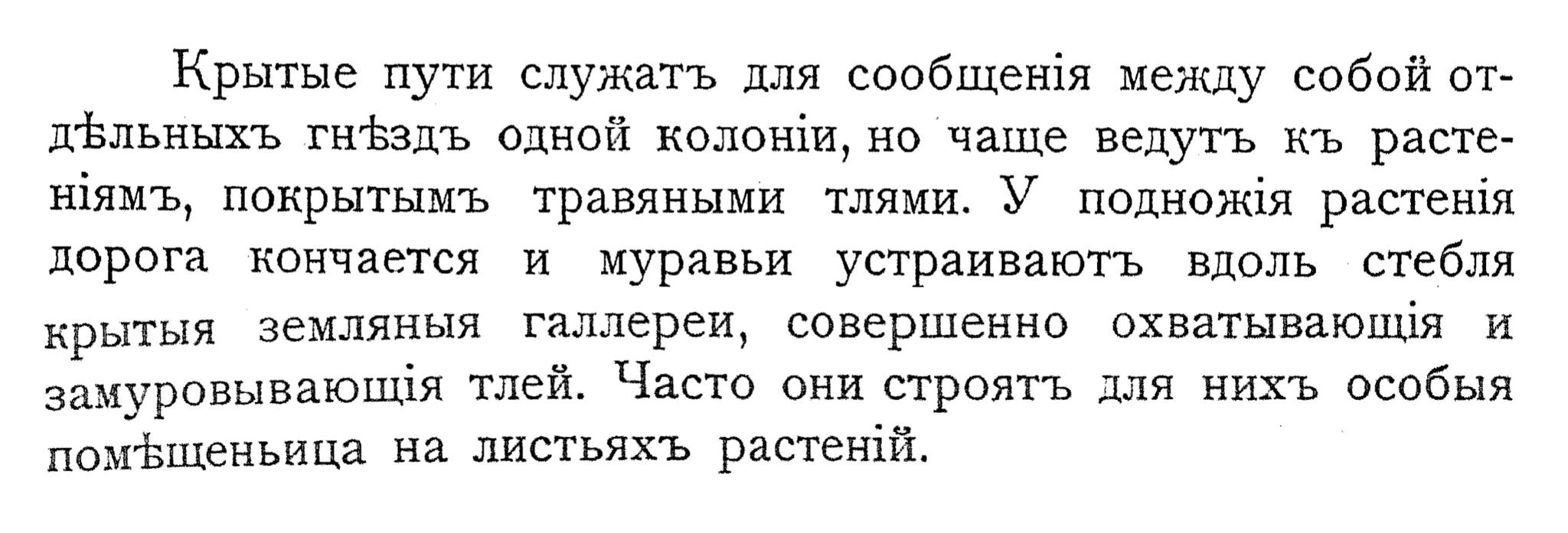 Крытые пути служатъ для сообщения между собой отдЪльныхъЪ гнФЪадъ одной колони, но чаще ведутъ къ растенямъ, покрытымъ травяными тлями. У подножия растения дорога кончается и муравьи устраиваютъ вдоль стебля крытыя земляныя галлереи, совершенно охватывающя и замуровываюния тлей. Часто они строятъ для нихъ особыя помЪщеньица на листьяхъ растений.