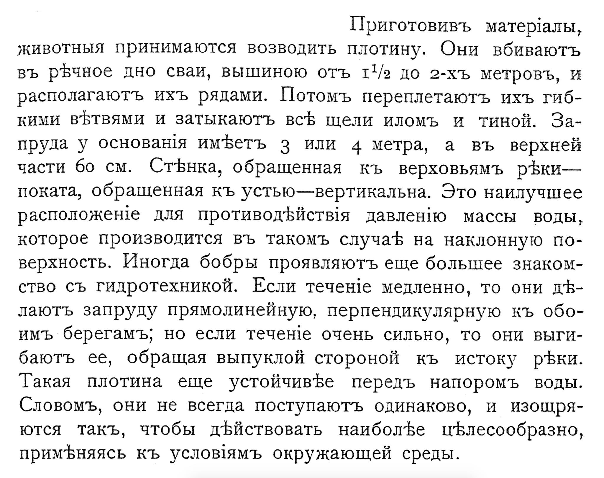 Приготовивъ матер1алы, животныя принимаются возводить плотину. Они вбиваютъ въ рБчное дно сваи, вышиною отъ 11/2 до 2-хъ метровЪ, и располагаютъ ихъ рядами. Потомъ переплетаютъ ихъЪ гибкими вЪтвями и затыкаютъ вс® щели иломъ и тиной. Запруда у основаня имФетъ 3 или 4 метра, а въ верхней части 6о см. СтЪнка, обращенная къ верховьямъ рЪки— поката, обращенная къ устью— вертикальна. Это наилучшее расположенте для противодЪИствя давлению массы Вводы, которое производится въ такомъ случаЪ на наклонную поверхность. Иногда бобры проявляютъ еще большее знакомство съ гидротехникой. Если течен1е медленно, то они дЪлаютъ запруду прямолинейную, перпендикулярную къ обоимъ берегамъ; но если течене очень сильно, то они выгибаютъ ее, обращая выпуклой стороной къ истоку рЪки. Такая плотина еще устойчивЪе передъ напоромъ воды. Словомъ, они не всегда поступаютъ одинаково, и изощряются такъ, чтобы дЪйствовать наиболЪе цлесообразно, примЪняясь къ условямъ окружающей среды.