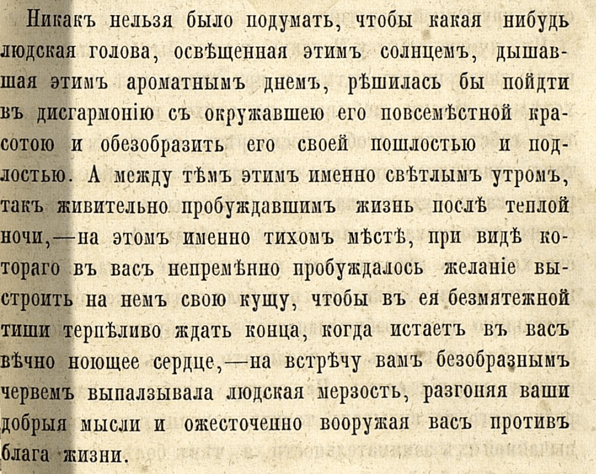 Никак нельзя было подумать, чтобы какая-нибудь голова, освещенная этим солнцем, дышавшая этим ароматным днем, решилась бы подойти в дисгармонию с окружавшей его повсеместной красотой и обезобразить его своей пошлостью и подлостью. А между тем этим именно светлым утром, так живительно пробуждавшим жизнь после теплой ночи, — на этом именно тихом месте, при виде которого в вас непременно пробуждалось желание выстроить на нем свою кущу, чтобы в ее безмятежной тиши терпеливо ждать конца, когда истает в вас вечно ноющее сердце — на встречу вам безобразным червем выпалзывала людская мерзость, разгоняя ваши добрые мысли и ожесточенно вооружая вас против блага жизни