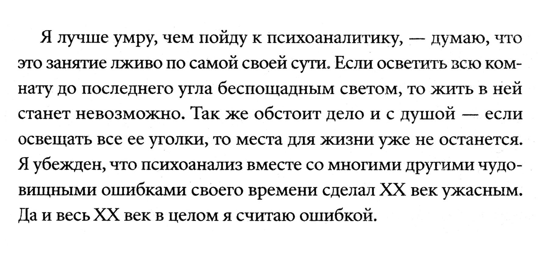 Я лучше умру, чем пойду к психоаналитику, — думаю, что это занятие лживо по самой своей сути. Если осветить всю комнату до последнего угла беспощадным светом, то жить в ней станет невозможно. Так же обстоит дело и с душой — если освещать все ее уголки, то места для жизни уже не останется. Я убежден, что психоанализ вместе со многими другими чудовищными ошибками своего времени сделал ХХ век ужасным. Да и весь ХХ век в целом я считаю ошибкой.