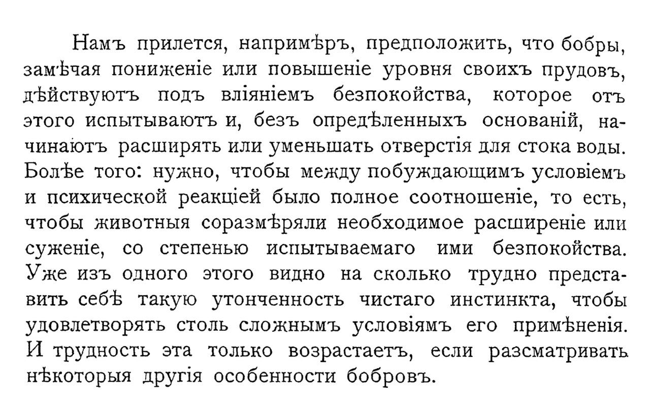 Намъ прилется, напримЪръ, предположить, что бобры, замЪчая понижен!е или повышенее уровня своихъ прудовъ, дЪйствуютъь подъ влянемъ безпокойства, которое отъ этого испытываютъ и, безъ опредЪленныхъ основанй, начинаютъ расширять или уменьшать отверстя для стока воды. БолФЪе того: нужно, чтобы между побуждающимъ условемъ и психической реакщей было полное соотношен1е, то есть, чтобы животныя соразмЪряли необходимое расширене или суженге, со степенью испытываемаго ими безпокойства. Уже изъ одного этого видно на сколько трудно представить себЪ такую утонченность чистаго инстинкта, чтобы удовлетворять столь сложнымъ условямъ его примЪненя. И трудность эта только возрастаетъ, если разсматривать нЪкоторыя другмя особенности бобровъ.