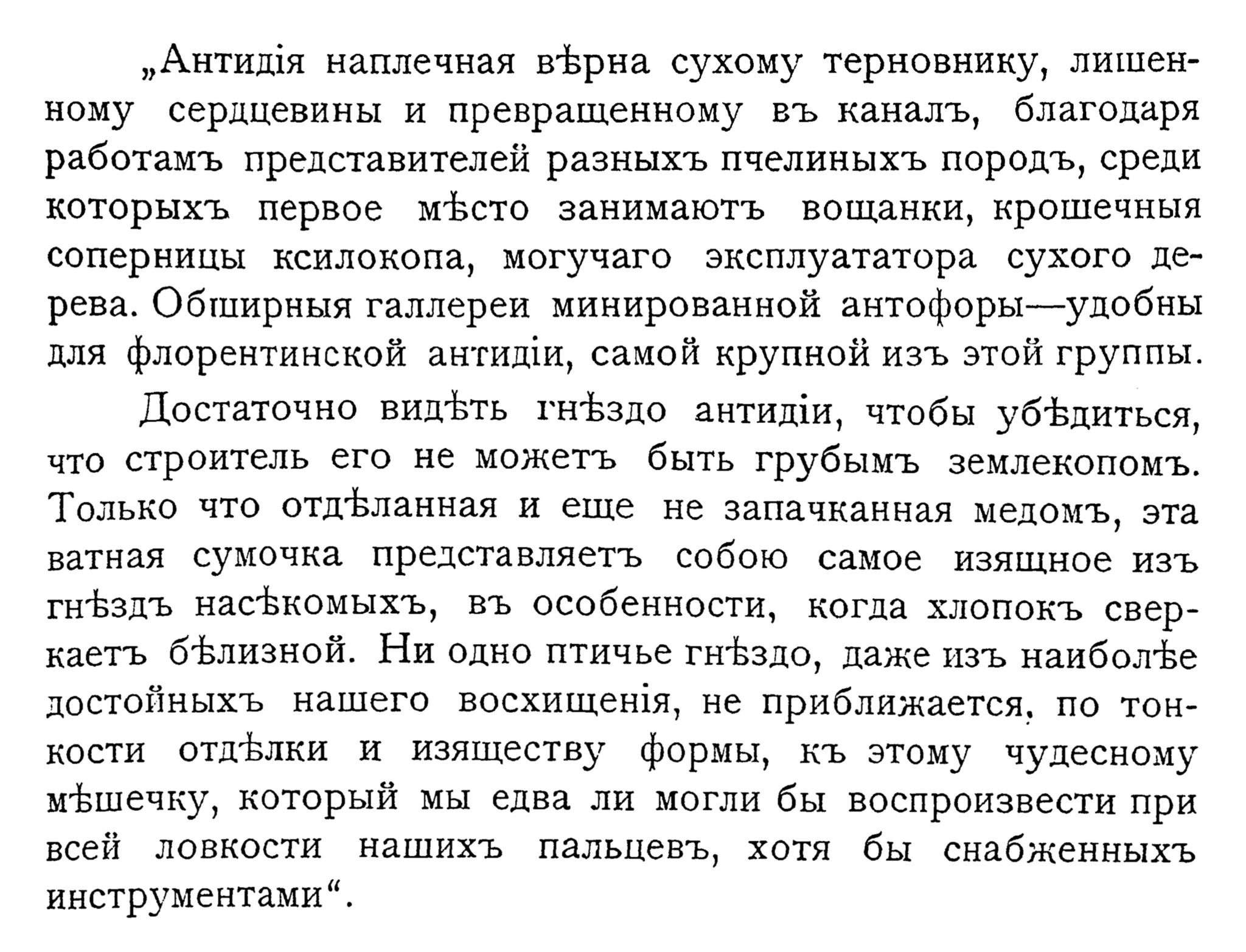 Достаточно видЪть гнЪздо антиди, чтобы убЪдиться, что строитель его не можетъ быть грубымъ землекопом»Ъ. Только что отдЪланная и еще не запачканная медомъЪ, эта ватная сумочка представляетъ собою самое изящное изъ гнЪздъ насЪкомыхъЪ, въ особенности, когда хлопокъ сверкаетъ бЪлизной. Ни одно птичье гнЪздо, даже изъ наиболЪе достойныхъ нашего восхищения, не прибляжается, по тонкости отдЪлки и изяществу формы, къ этому чудесному мЪшечку, который мы едва ли могли бы воспроизвести при всей ловкости нашихъ пальцевъ, хотя бы снабженныхъЪ инструментами“.