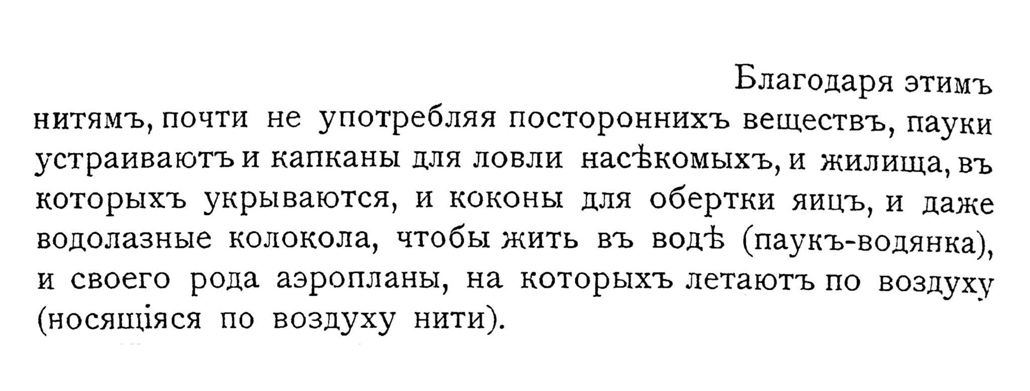 устраиваютъ и капканы для ловли насЪкомыхъ, и жилища, въ которыхъ укрываются, и коконы для обертки яицъ, и даже водолазные колокола, чтобы жить въ водЪ (паукъ-водянка),