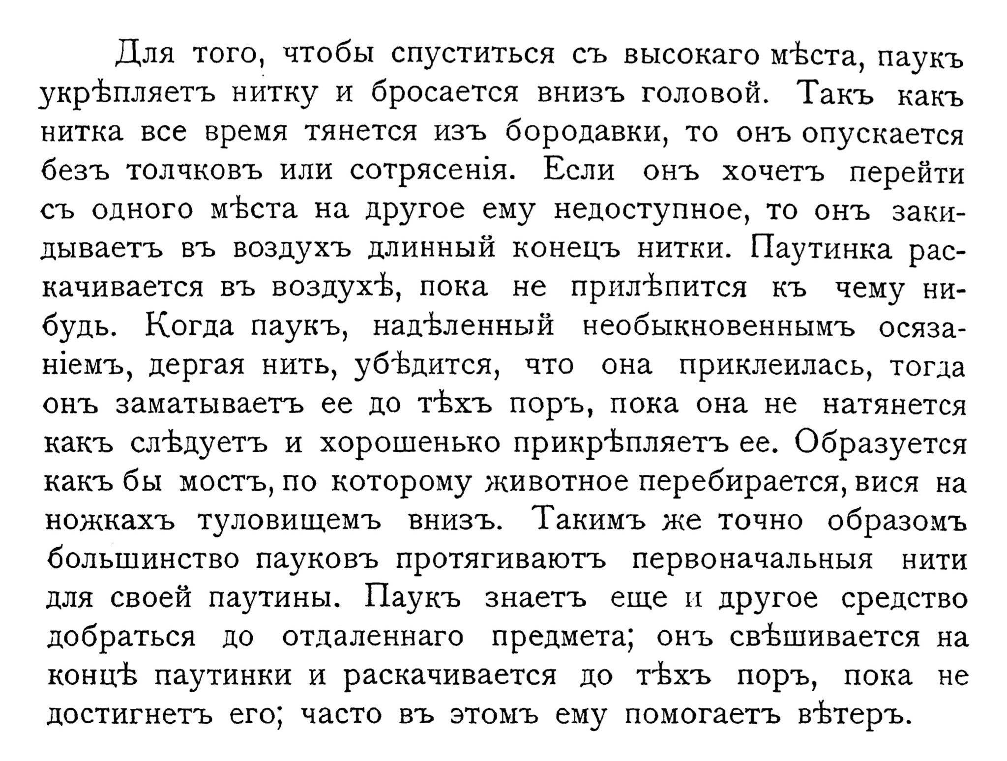 Для того, чтобы спуститься съ высокаго мЪста, паукъ укрЪпляетъ нитку и бросается внизъ головой. Такъ какъ нитка все время тянется изъ бородавки, то онъ опускается безъ толчковъ или сотрясеня. Если онъ хочетъ перейти съ одного мЪста на другое ему недоступное, то онъ закидываетъ въ воздухъ длинный конецъ нитки. Паутинка раскачивается въ воздухЪ, пока не прилЪпится къ чему нибудь. Когда паукъ, надЪленный необыкновеннымъЪ осязанемъ, дергая нить, убЪдится, что она приклеилась, тогда онъ заматываетъ её до тБхъ поръ, пока она не натянется какъ слЪдуетъ и хорошенько прикрЪпляетъ ее. Образуется какъ бы мостъ, по которому животное перебирается, вися на ножкахъ туловищемъ внизъ. Такимъ же точно образомъ большинство пауковъ протягиваютъ первоначальныя нити для своей паутины. Паукъ знаетъ еще и другое средство добраться до отдаленнаго предмета; онъ свЪшивается на концЪ паутинки и раскачивается до тЪхъ поръ, пока не достигнетъ его; часто въ этомъ ему помогаетъ вЪтер».