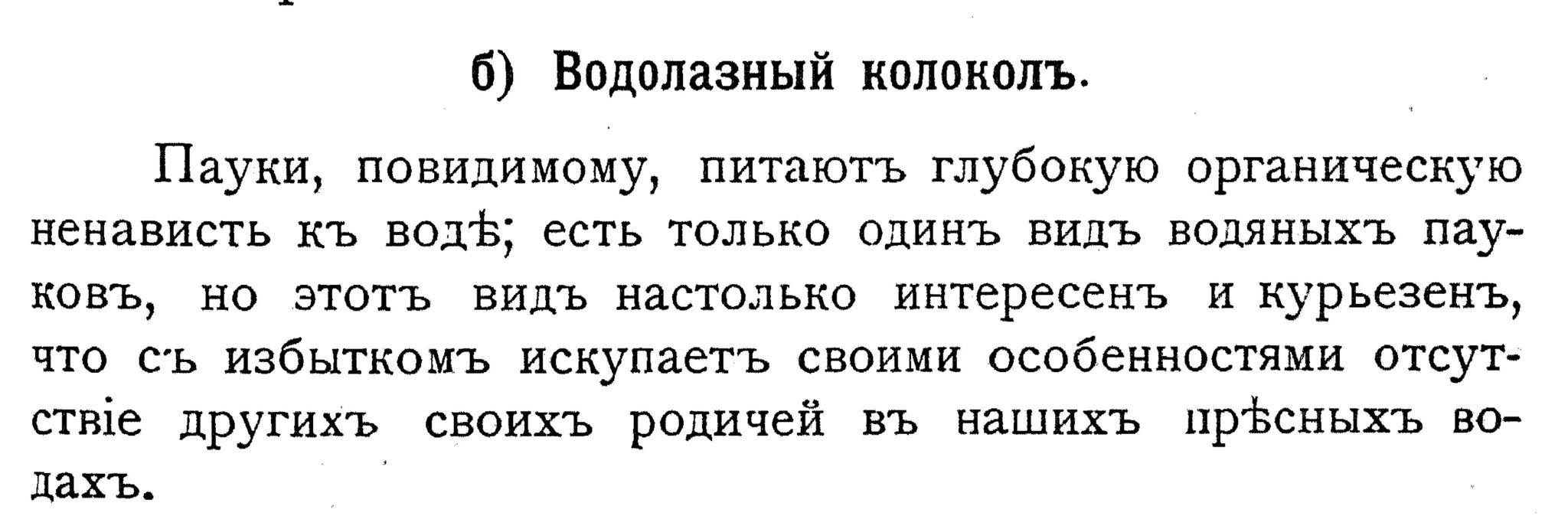 Пауки, повидимому, питаютъ глубокую органическую ненависть къ водЪ; есть только одинъ видъ водяныхЪ пауковъ, но этотъ видъ настолько интересенъ и курьезенъ, что съ избыткомъ искупаетъ своими особенностями отсутств1е другихъ своихъ родичей въ нашихъ прЪсныхъЪ водахъ.