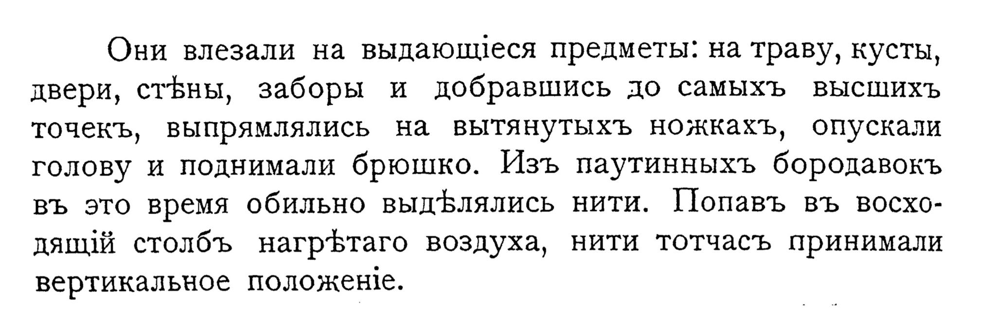 Они влезали на выдаюшщиеся предметы: на траву, кусты, двери, стВны, заборы и добравшись до самыхъ высшихЪ точекъ, выпрямлялись на вытянутыхъ ножкахъ, опускали голову и поднимали брюшко. Изъ паутинныхъ бородавокъ въ это время обильно выдЪлялись нити. Попавъ въ восхо дяпий столбъ нагрЪтаго воздуха, нити тотчасъ принимали вертикальное положенче.