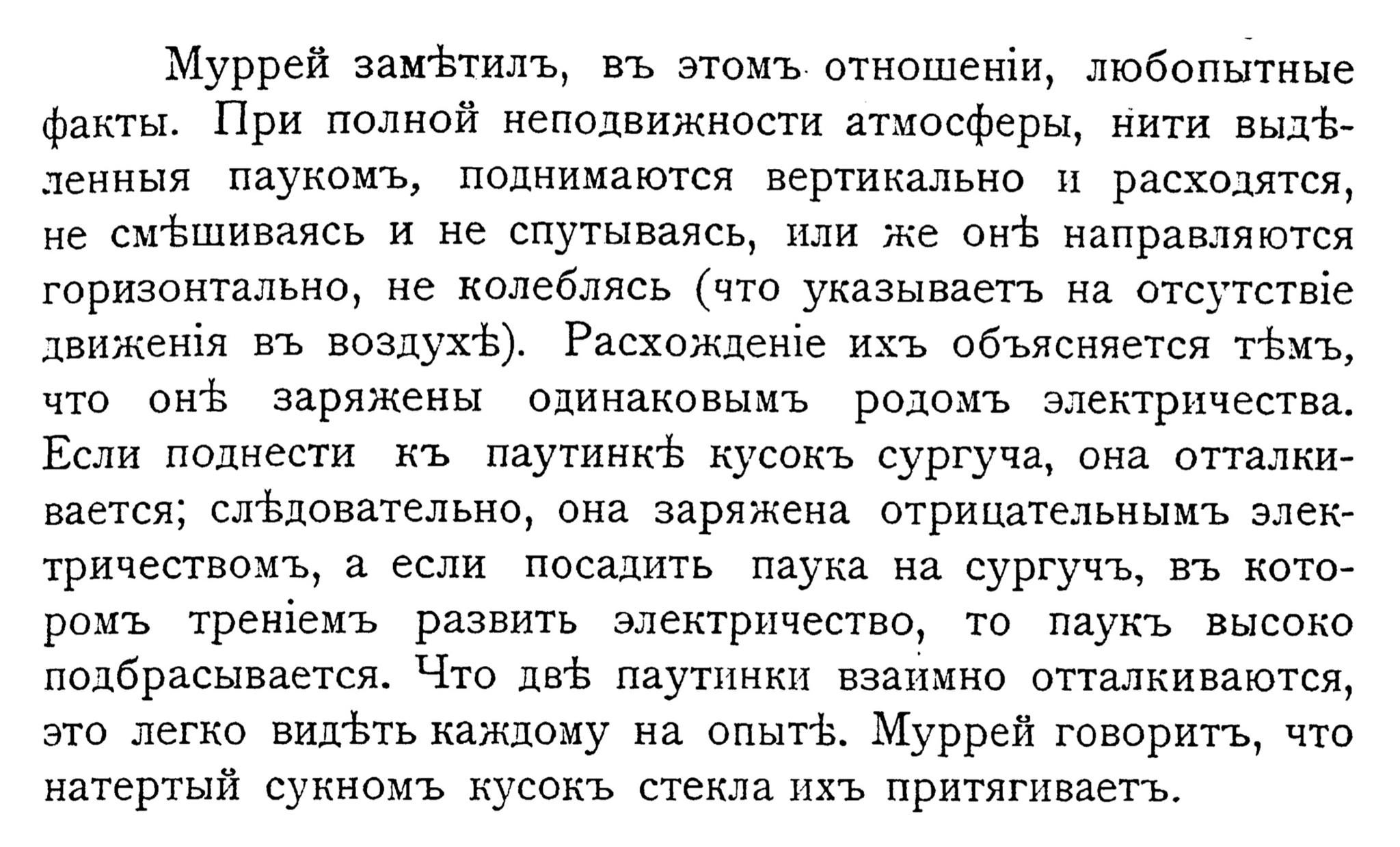 Муррей замЪтилъ, въ этомъ. отношени, любопытные факты. При полной неподвижности атмосферы, нити выдЪленныя паукомъ, поднимаются вертикально и расходятся, не смБшиваясь и не спутываясь, или же онЪ направляются горизонтально, не колеблясь (что указываетъ на отсутств!е движеня въ воздухЪ). Расхождене ихъ объясняется тЪмъ, что онЪ заряжены одинаковымъ родомъ электричества. Если поднести къ паутинкЪ кусокъ сургуча, она отталкивается; слЪдовательно, она заряжена отрицательнымЪ электричествомъ, а если посадить паука на сургучъ, въ которомъ тренемъ развить электричество, то паукъ высоко подбрасывается. Что двЪ паутинки взаимно отталкиваются, это легко видЪть каждому на опытЪ. Муррей говоритъ, что натертый сукномъ кусокъ стёекла ихъ притягиваетъ.