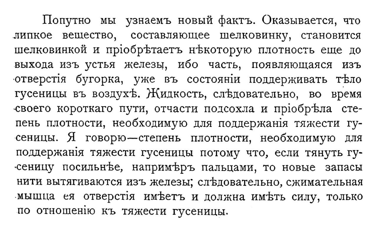 Попутно мы узнаемъ новый фактъ. Оказывается, что липкое вещество, составляющее шелковинку, становится шелковинкой и прюбрЪтаетъ нЪкоторую плотность еще до выхода изъ устья железы, ибо часть, появляющаяся изъ ‚отверстя бугорка, уже въ состояни поддерживать тЪло гусеницы въ воздухЪ. Жидкость, слЪдовательно, во время ‘своего короткаго пути, отчасти подсохла и прюбрЪла степень плотности, необходимую для поддержания тяжести гусеницы. Я говорю—степень плотности, необходимую для поддержания тяжести гусеницы потому что, если тянуть гу‘сеницу посильнЪе, напримЪръ пальцами, то новые запасы нити вытягиваются изъ железы; слЪдовательно, сжимательная