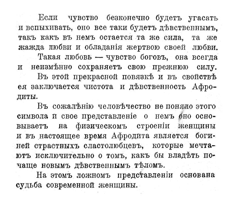Въ сожал®ню человЪчество не поняйо этого символа й свое представлен!е о немъ бно основываетъ —на физическомъ строен!и женщины и въ настоящее время Афродита является богиней страстныхъ сластолюбцевъ, которые мечтаютъ исключительно о томъ, какъ бы владЪть почаще новымъ дФветвеннымЪ тЪломъЪ.