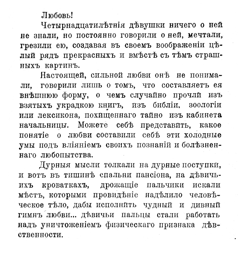 Дурныя мысли толкали на дурные поступки, и вотъ въ тишинЪ спальни панс1она, на дЪвичьихъ кроваткахъ, дрожащие пальчики искали мФстъ, которыми провидЪн!е надФлило челов®ческое тЪло, дабы исполнить чудный и дивный тимяъ любви... дЪвичьи пальцы стали работать надъ уничтожен!1емъ физическаго признака дЪвственности.