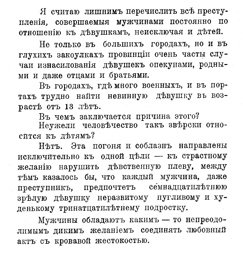 НъЪтъ. Эта погоня и соблазнъ направлены исключительно къ одной цЪли — къ страстному желаню нарушить дЪвственную плеву, между тЪмъ казалось бы, что каждый мужчина, даже преступникъ, предпочтетъ — семнадцатилЪтнюю врелую дЪвушку неразвитому пугливому и худенькому тринатцатилЪтнему подростку.