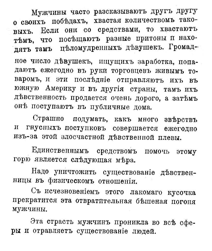 Надо уничтожить существованіе дъвственНИЦцЫ ВвъЪ физическомъ отвошени. Съ исчезновен1емъ этого лакомаго кусочка