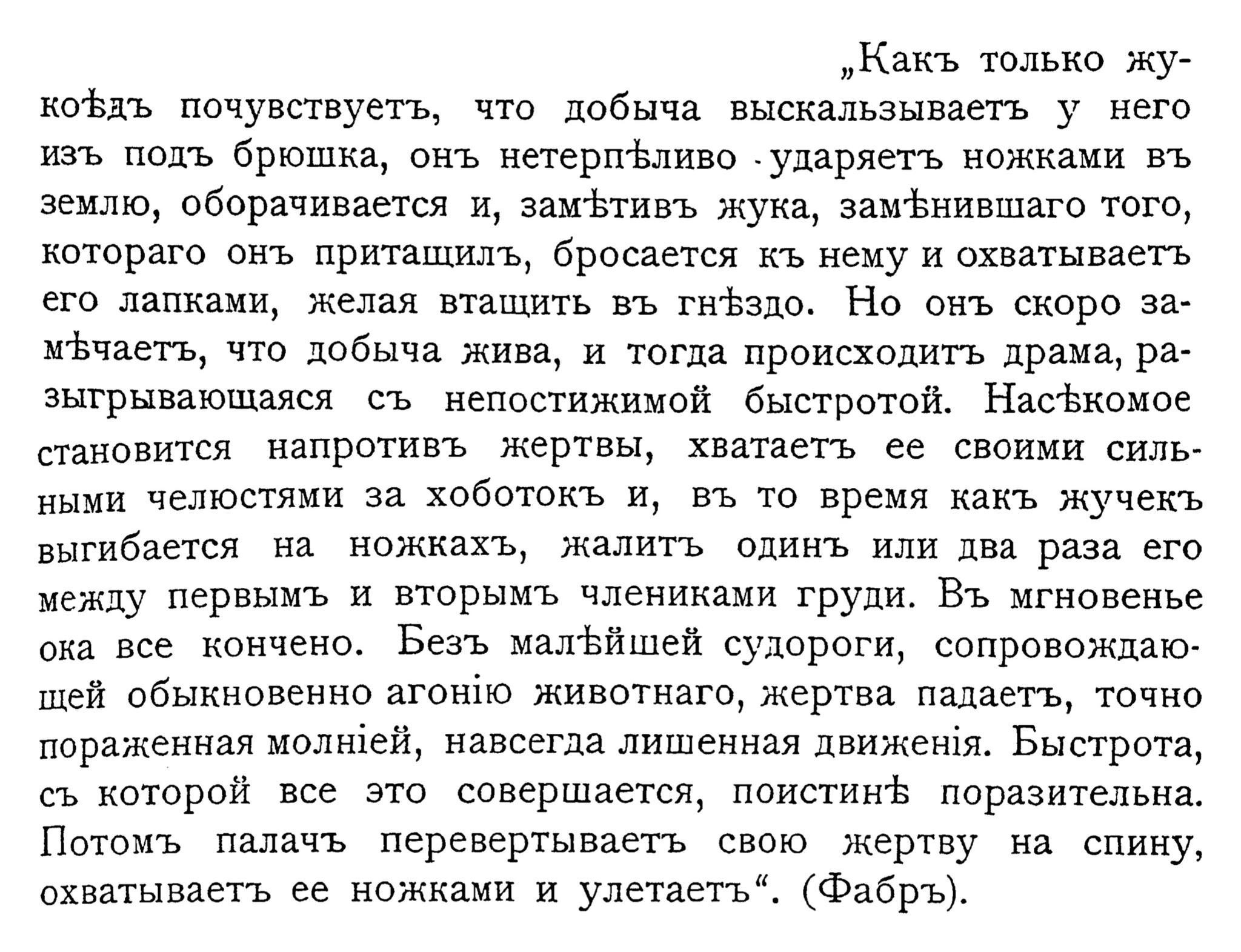 „Какъ только жукоФдъ почувствуетъ, что добыча выскальзываеть у него изъ подъ брюшка, онъ нетерпЪливо - ударяетъ ножками въ землю, оборачивается и, замЪтивъ жука, замЪнившаго того, котораго онъ притащилъ, бросается къ нему и охватываетъ его лапками, желая втащить въ гнЪздо. Но онъ скоро замЪчаетъ, что добыча жива, и тогда происходитъ драма, разыгрывающаяся съ непостижимой быстротой. НасЪкомое становится напротивъ жертвы, хватаетъ ее своими сильными челюстями за хоботокъ и, въ то время какъ жучекъ выгибается на ножкахъ, жалитъ одинъ или два раза его между первымъ и вторымъ члениками груди. Въ мгновенье ока все кончено. Безъ малЪйшей судороги, сопровождающей обыкновенно агон1ю животнаго, жертва падаетъ, точно пораженная молшей, навсегда лишенная движения. Быстрота, съ которой все это совершается, поистинЪ поразительна. Потомъ палачъ перевертываеть свою жертву на спину, охватываетъ ее ножками и улетаетъ“. (Фабръ).