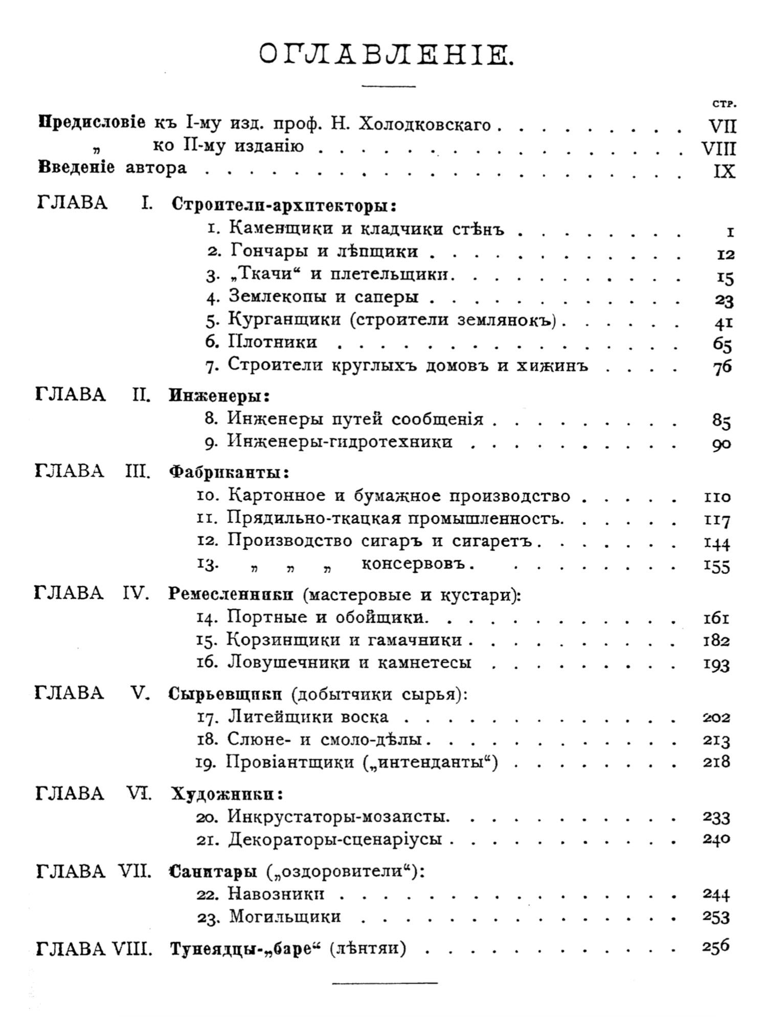 Строптели-архптекторы: т. Каменщики и кладчики ст%нъ . 2. Гончары и лЪпщики . 3. „Гкачи“ и плетельщики. 4. Землекопы и саперы . . : 5. Курганщики (строители зенлянокъ) 6. Плотники : : ‚ » 7. Строители круглыхъ домовъ и хижЖинъЪ